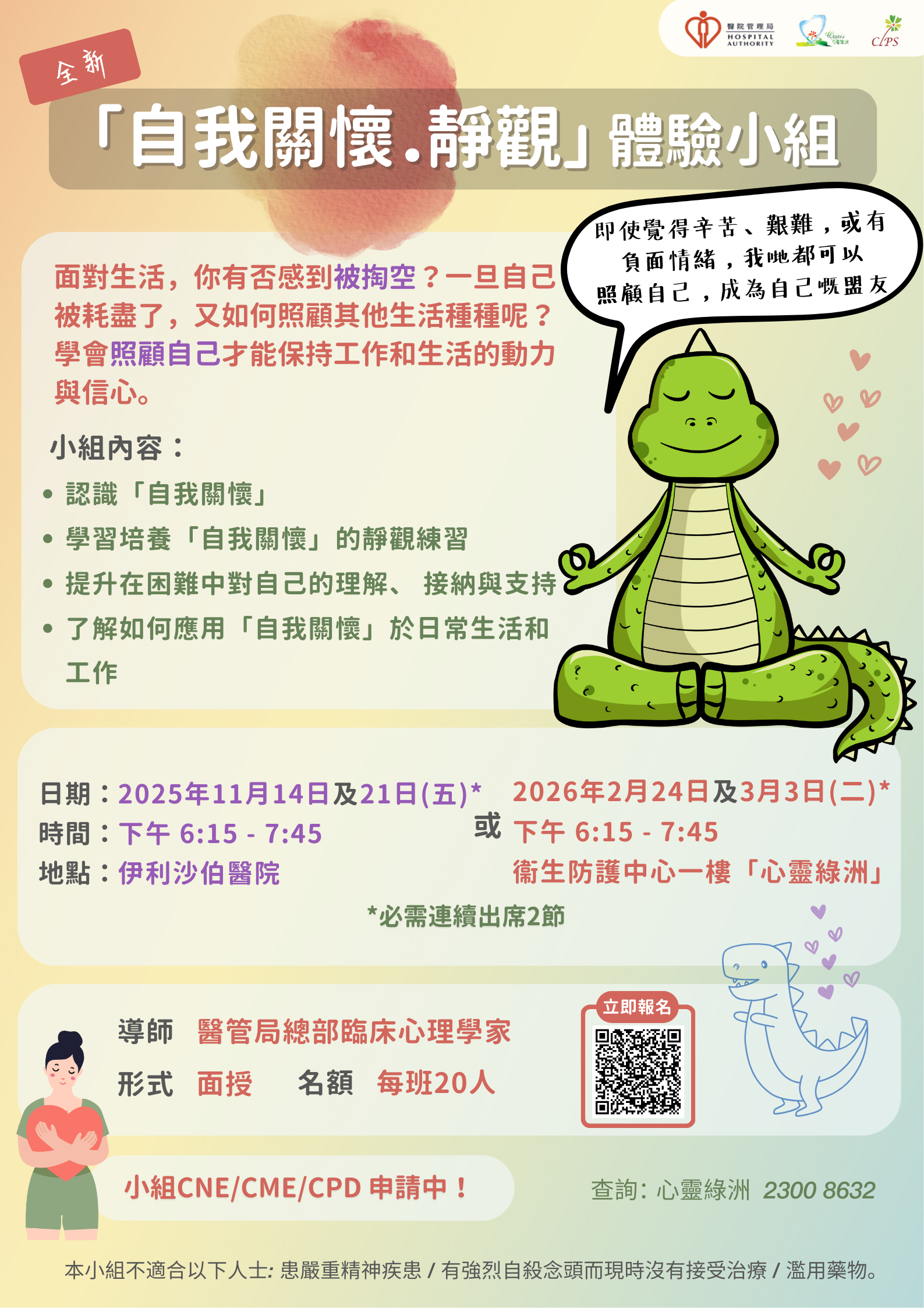 「自我關懷.靜觀」體驗小組 2025-08-11 為了和大家一起持續練習「自我關懷」,並在工作與生活中更好地照顧自己,「心靈綠洲」誠摯邀請您參加「自我關懷‧靜觀」體驗小組,每天理解自己、關心自己多一點。 每班名額只有20 個,馬上按此報名參與! 活動詳情: 報名請按此!